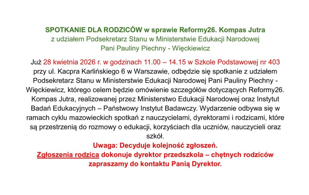 Rekrutacja do przedszkoli na nowy rok szkolny 2024/2025: https://edukacja.um.warszawa.pl/przedszkola